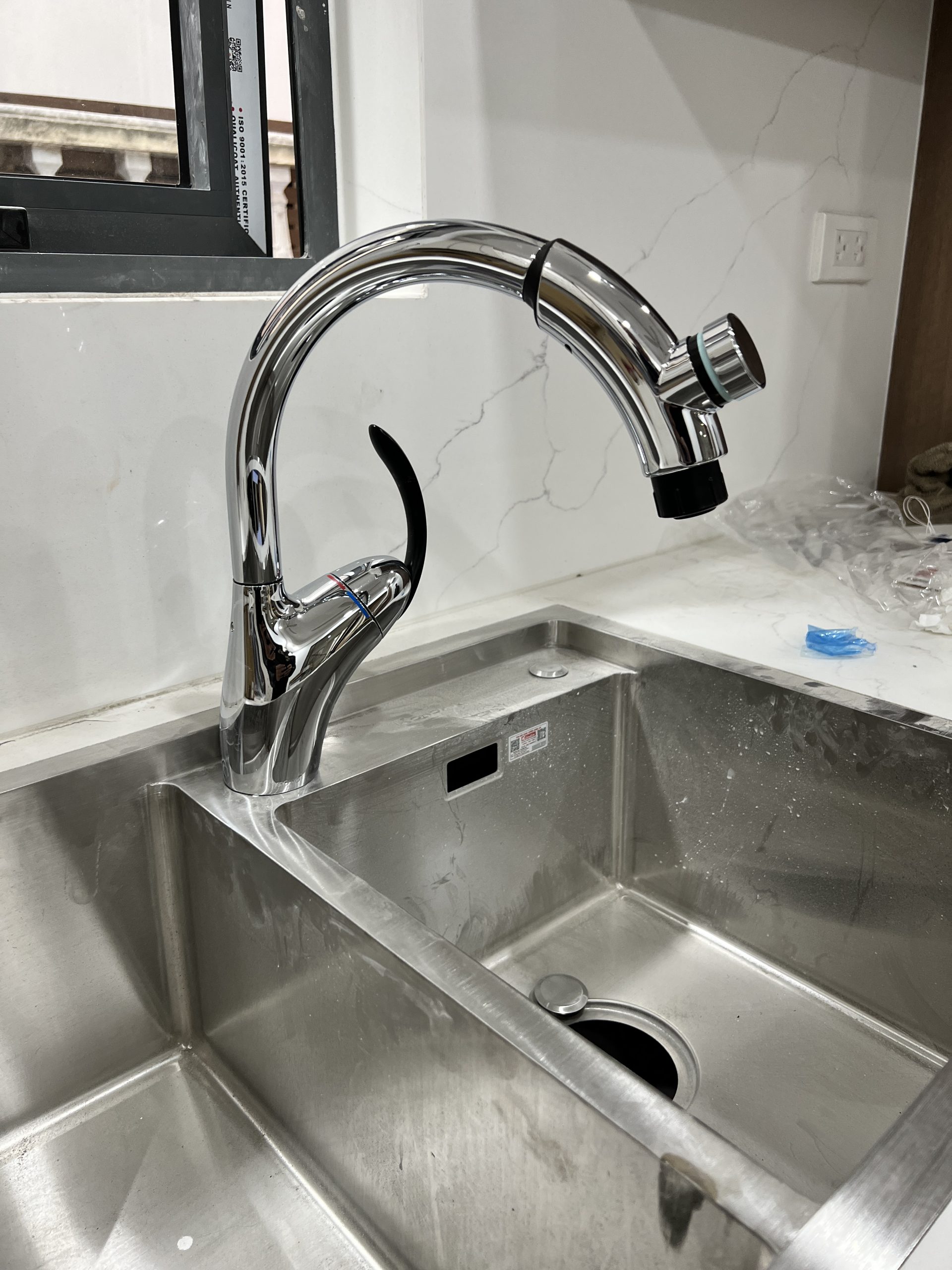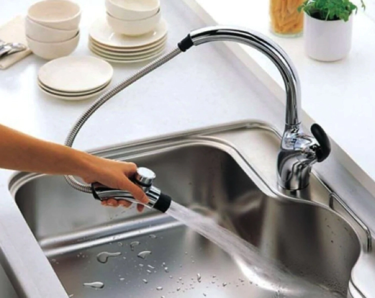 Kiểu lắp đặt gắn chậu, đầu vòi có thể rút dây kéo dài tới 650 mm, giúp người dùng linh hoạt rửa xoong nồi hoặc vệ sinh khu vực xung quanh bồn rửa dễ dàng.